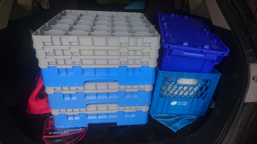 The kits are available in either 12 or 24 settings.  We rented the 24-place settings – as you can see, it’s quite a few dishes!  It included flatware, plates, bowls, water glasses, and soup mugs. The kit also contains laminated placemats with the “Hello, Let’s Eat” logo.