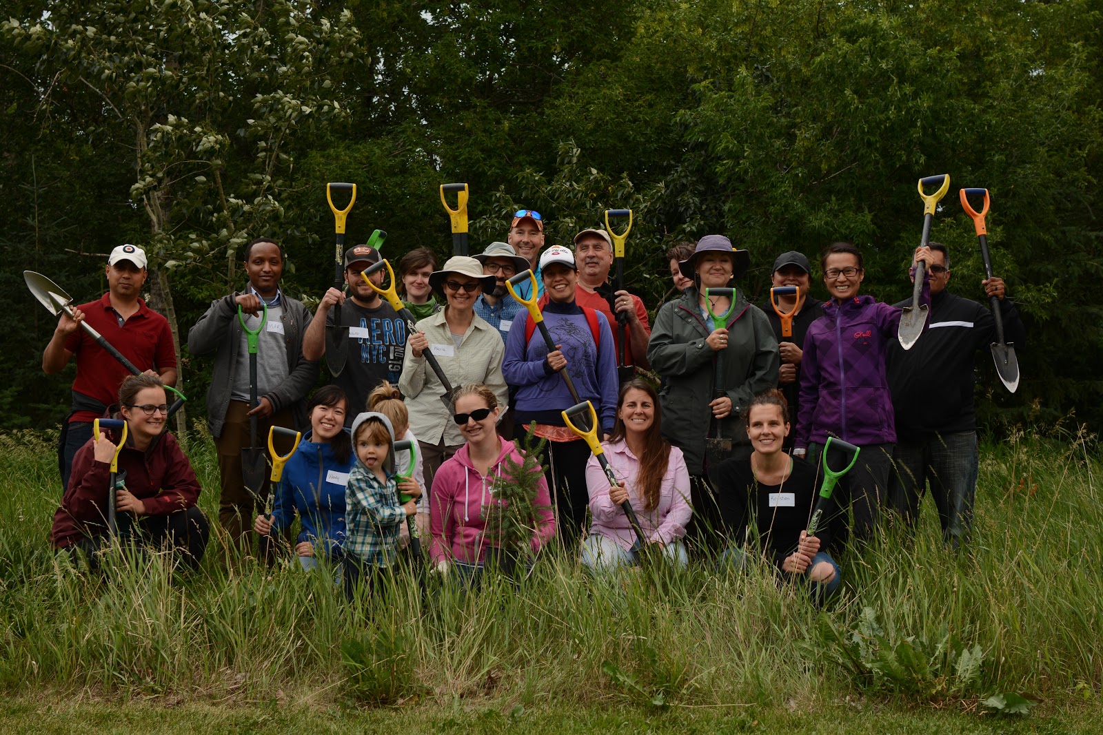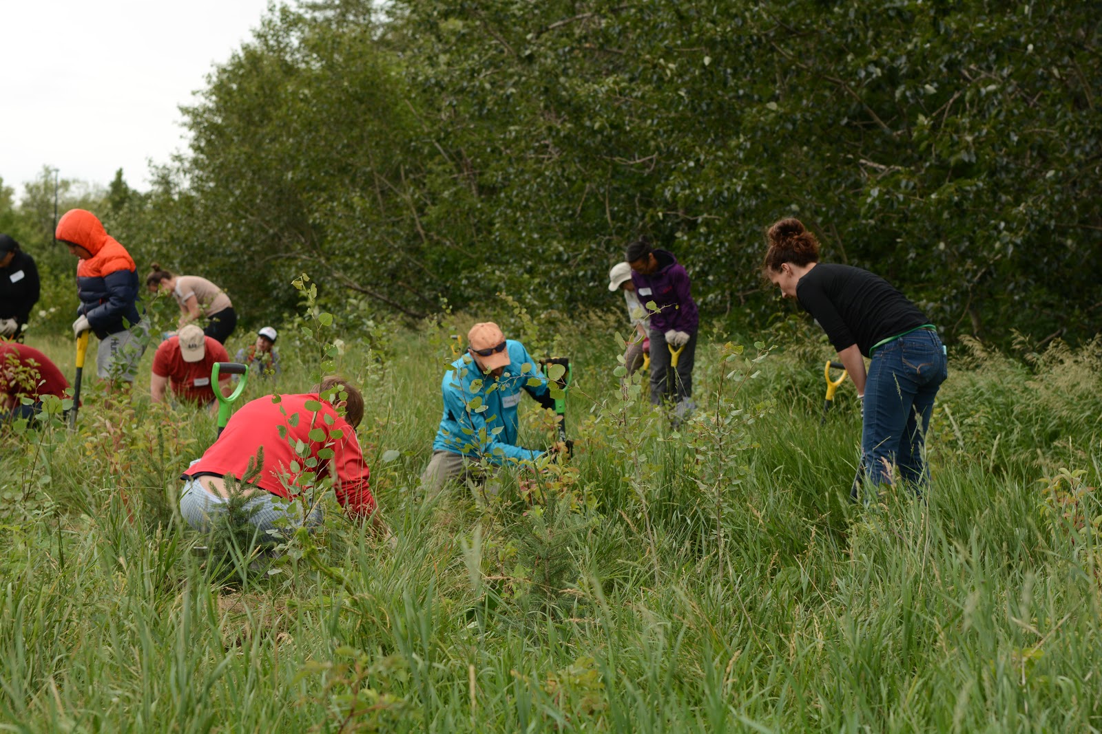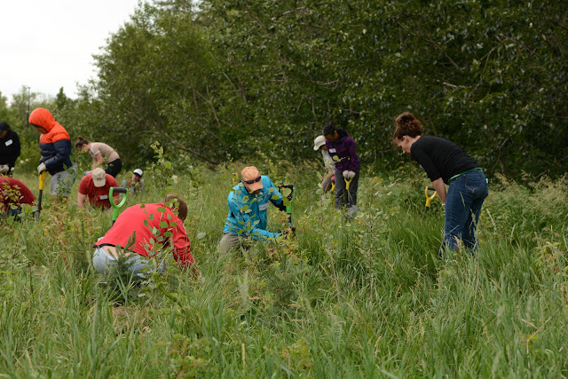 Staff with the City of Edmonton's Root for Trees program taught us about naturalization of urban areas. This includes letting the grass in an area grow (no mowing) in the first year and planting trees and shrubs in the second year. The new plants slowly take over, returning the area to a more natural landscape.